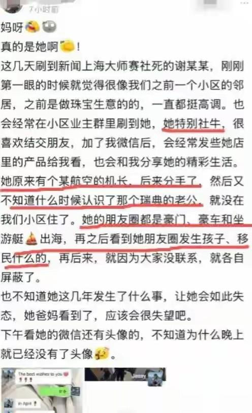说起这个谢某,我跟你们说,她以前住的小区里有人爆料,说她以前性格挺外向的,后来嫁给那个瑞典人之后,就慢慢跟邻居们疏远了,好像觉得自己不一样了,在社交媒体上,她可高调了,天天晒豪车,名表,各种奢侈品,还晒银行给她的VIP待遇,好像生怕别人不知道她现在过得多好似的,有人说她是做珠宝生意的,也不知道真假,反正她老公给她买了房子,车子,还帮她办了瑞典的居住证,反正就是各种炫耀,恨不得让全世界都知道她嫁了个有钱的老外。